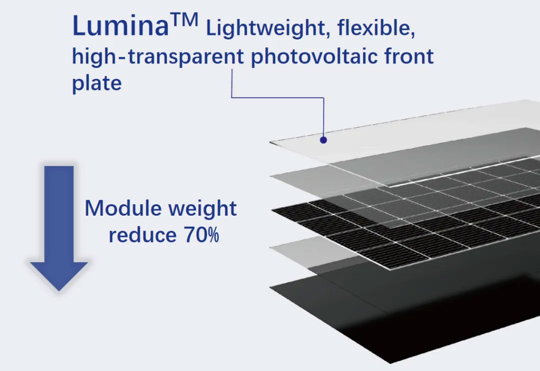 優(yōu)美特的解決方案:Lumina™輕量化革新,針對行業(yè)痛點,優(yōu)美特依托20年復合材料研發(fā)與應用經驗,推出創(chuàng)新產品Lumina™光伏前板。該產品以丙烯酸樹脂與玻璃纖維為核心材料,重量較傳統玻璃組件減輕70%,保證組件可靠性的同時顯著降低屋頂加固需求與安裝成本。其技術優(yōu)勢包括: