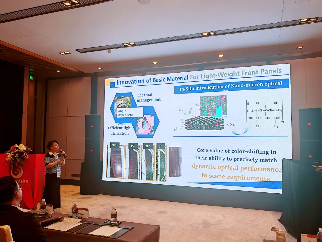 由優(yōu)美特研發(fā)工程師蔡曉嬌主講,她指出,隨著光伏建筑一體化(BIPV)應用的快速發(fā)展,封裝材料對美觀性與高效性能的雙重要求愈加顯著。通過對改性聚烯烴(POE)基材與多層納米鍍膜技術的研究,確保炫彩前板在高溫、高濕、強紫外等復雜環(huán)境下仍具優(yōu)異的機械性能與耐候表現(xiàn)。