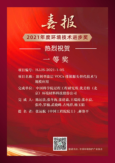 2022年初,中國環(huán)保產(chǎn)業(yè)協(xié)會正式對外揭曉2021年度環(huán)境技術(shù)進(jìn)步獎結(jié)果,優(yōu)美特“溶劑型涂層VOCs排放源頭替代技術(shù)與規(guī)模應(yīng)用”項目,榮獲環(huán)境技術(shù)進(jìn)步一等獎。